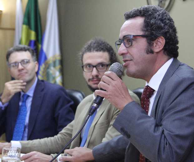 No segundo dia de palestras no I Seminário Referências Internacionais em Direitos Humanos, Carlos Gaio, Guilherme Pontes e Emanuel Queiroz compuseram a mesa