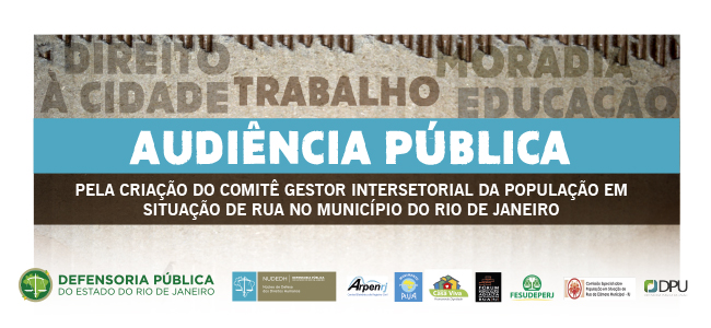 Tendo em vista a importância do tema, a Defensoria Pública do Estado do Rio de Janeiro, através do Núcleo de Defesa dos Direitos Humanos, promove no dia 13 de maio, às 13h, audiência pública pela criação do Comitê Gestor Intersetorial da População em Situação de Rua no município do Rio de Janeiro. O evento acontece no auditório do 4º andar.